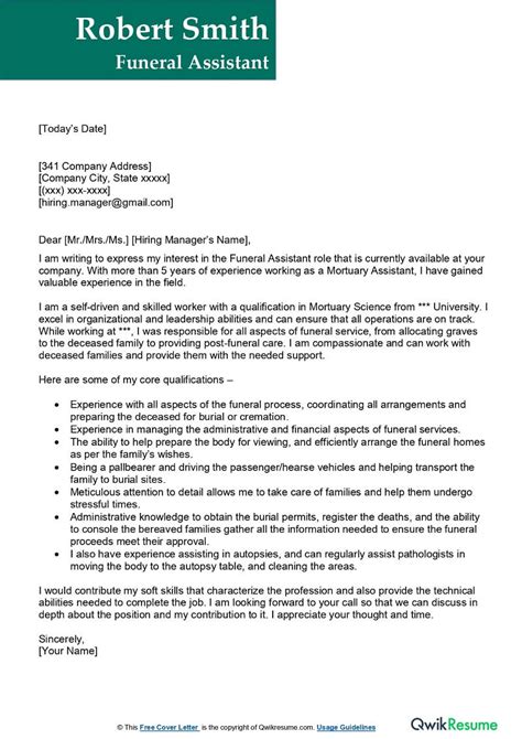 Cover Letter For Funeral Assistant . A funeral assistant is hired to support the funeral director and staff members at the funeral place. When crafting a cover letter for a funeral service assistant position, it's crucial to emphasize your strong customer service skills.